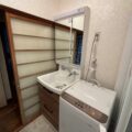 洗面所も狭いため、お客様から洗濯機と洗面台を並べたいとのご要望がありました。洗濯機の寸法を測り、新規洗面台の寸法を小さくしても既存の物より大きくなってしまい、計算上どうしても並べる事が出来ませんでしたが、浴室と洗面所の間に浴室の寸法ギリギリに壁を作った事で、何ミリかの隙間で洗濯機と洗面台を並べる事が出来ました。洗面所の壁はクロス、床はクッションフロアで仕上げました。